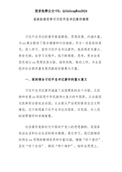 【七哥公文】2025年:县政协委员学习习近平总书记著作感想+更多免费公文+VX:QiGeGongWen2024+更多免费公文+VX:QiGeGongWen2024