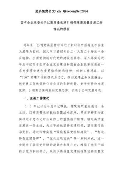 【七哥公文】2025年:国有企业党委关于以高质量党建引领保障高质量发展工作情况的报告+更多免费公文+VX:QiGeGongWen2024+更多免费公文+VX:QiGeGongWen2024