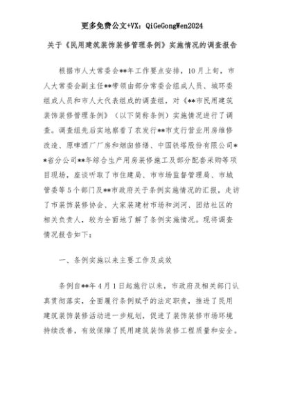【七哥公文】2025年:关于《民用建筑装饰装修管理条例》实施情况的调查报告+更多免费公文+VX:QiGeGongWen2024+更多免费公文+VX:QiGeGongWen2024