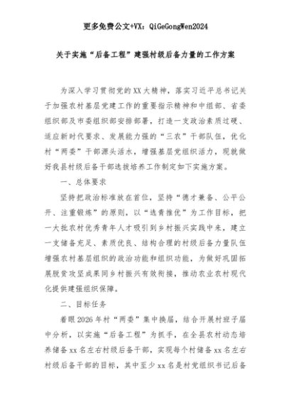 【七哥公文】2025年:关于实施“后备工程”建强村级后备力量的工作方案+更多免费公文+VX:QiGeGongWen2024+更多免费公文+VX:QiGeGongWen2024