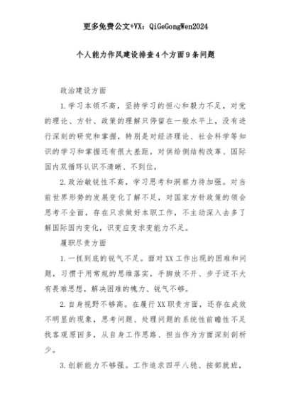 【七哥公文】2025年:个人能力作风建设排查4个方面9条问题+更多免费公文+VX:QiGeGongWen2024+更多免费公文+VX:QiGeGongWen2024