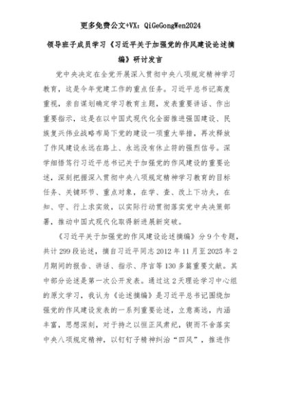 【七哥公文】2025年:领导班子成员学习《习近平关于加强党的作风建设论述摘编》研讨发言+更多免费公文+VX:QiGeGongWen2024+更多免费公文+VX:QiGeGongWen2024