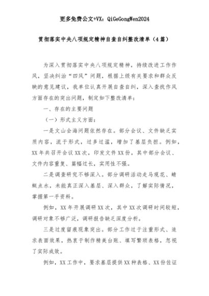 【七哥公文】2025年:(4篇)贯彻落实中央八项规定精神自查自纠整改清单+更多免费公文+VX:QiGeGongWen2024+更多免费公文+VX:QiGeGongWen2024