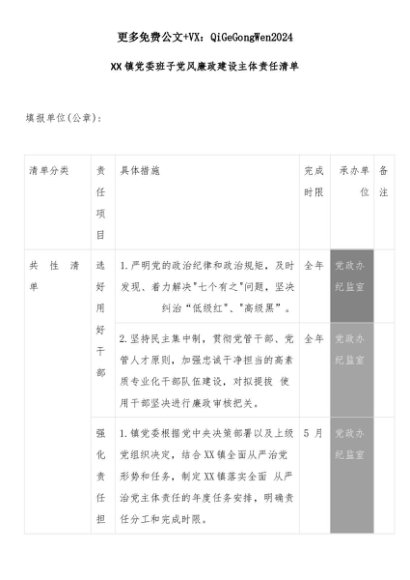 【七哥公文】2025年:XX镇党委班子党风廉政建设主体责任清单+更多免费公文+VX:QiGeGongWen2024+更多免费公文+VX:QiGeGongWen2024