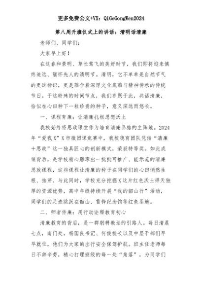 【七哥公文】2025年:第八周升旗仪式上的讲话:清明话清廉+更多免费公文+VX:QiGeGongWen2024+更多免费公文+VX:QiGeGongWen2024