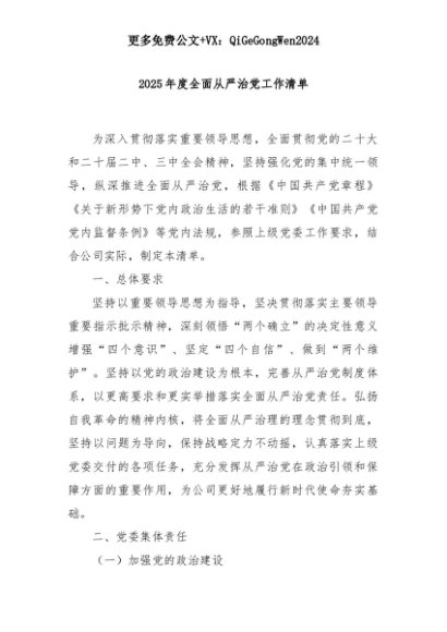 【七哥公文】2025年:2025年度全面从严治党工作清单+更多免费公文+VX:QiGeGongWen2024+更多免费公文+VX:QiGeGongWen2024