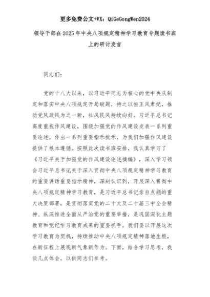 【七哥公文】2025年:领导干部在2025年中央八项规定精神学习教育专题读书班上的研讨发言+更多免费公文+VX:QiGeGongWen2024+更多免费公文+VX:QiGeGongWen2024