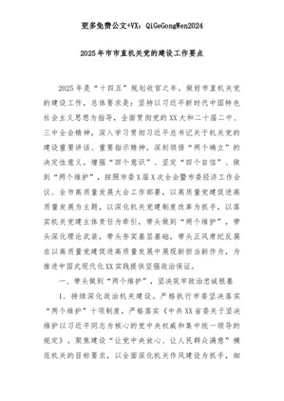 【七哥公文】2025年:2025年市市直机关党的建设工作要点+更多免费公文+VX:QiGeGongWen2024+更多免费公文+VX:QiGeGongWen2024