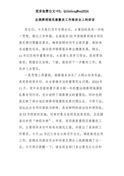 【七哥公文】2025年:在殡葬领域巡察整改工作推进会上的讲话+更多免费公文+VX:QiGeGongWen2024+更多免费公文+VX:QiGeGongWen2024