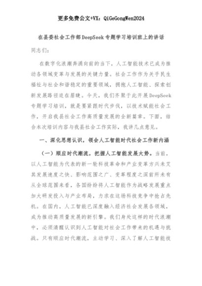 【七哥公文】2025年:在县委社会工作部DeepSeek专题学习培训班上的讲话+更多免费公文+VX:QiGeGongWen2024+更多免费公文+VX:QiGeGongWen2024