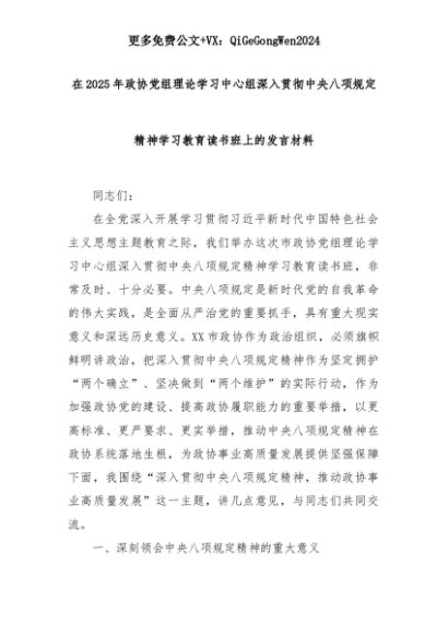 【七哥公文】2025年:在2025年政协党组理论学习中心组深入贯彻中央八项规定精神学习教育读书班上的发言材料+更多免费公文+VX:QiGeGongWen2024+更多免费公文+VX:QiGeGongWen2024
