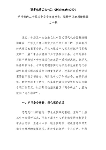 【七哥公文】2025年:学习党的二十届三中全会交流发言:坚持学以致用增强能力本领+更多免费公文+VX:QiGeGongWen2024+更多免费公文+VX:QiGeGongWen2024