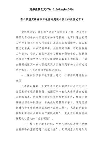 【七哥公文】2025年:在八项规定精神学习教育专题读书班上的交流发言3+更多免费公文+VX:QiGeGongWen2024+更多免费公文+VX:QiGeGongWen2024