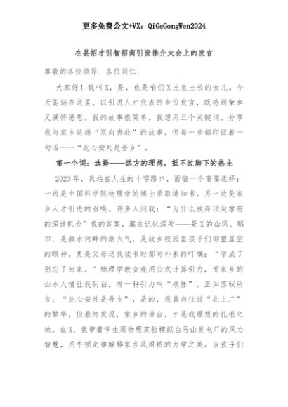 【七哥公文】2025年:在县招才引智招商引资推介大会上的发言+更多免费公文+VX:QiGeGongWen2024+更多免费公文+VX:QiGeGongWen2024