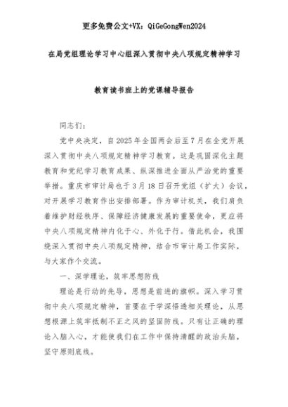 【七哥公文】2025年:在局党组理论学习中心组深入贯彻中央八项规定精神学习教育读书班上的党课辅导报告+更多免费公文+VX:QiGeGongWen2024+更多免费公文+VX:QiGeGongWen2024