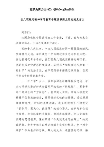 【七哥公文】2025年:在八项规定精神学习教育专题读书班上的交流发言2+更多免费公文+VX:QiGeGongWen2024+更多免费公文+VX:QiGeGongWen2024