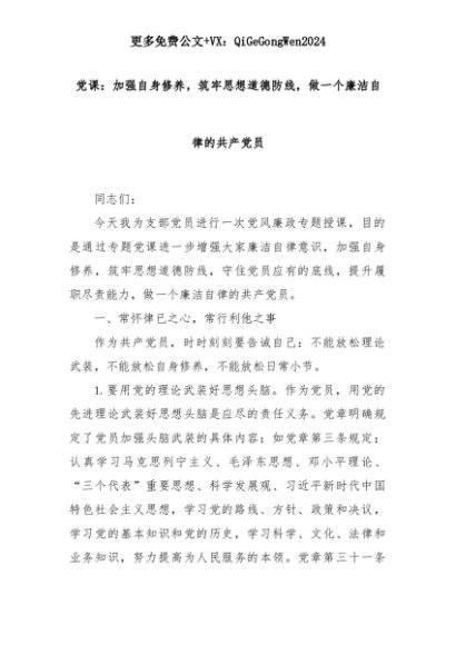 【七哥公文】2025年:党课:加强自身修养,筑牢思想道德防线,做一个廉洁自律的共产党员+更多免费公文+VX:QiGeGongWen2024+更多免费公文+VX:QiGeGongWen2024