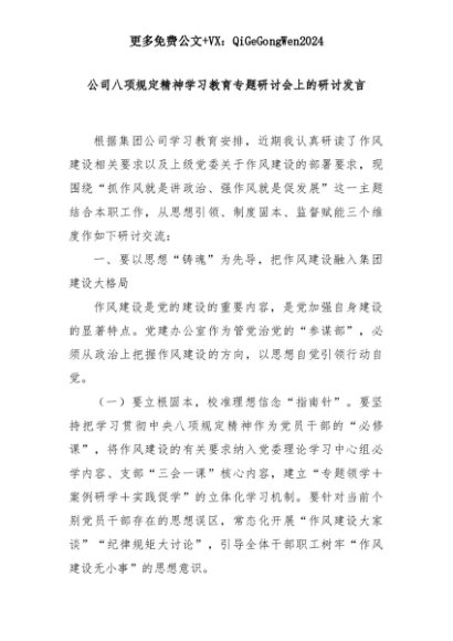 【七哥公文】2025年:公司八项规定精神学习教育专题研讨会上的研讨发言+更多免费公文+VX:QiGeGongWen2024+更多免费公文+VX:QiGeGongWen2024
