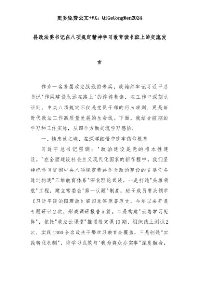 【七哥公文】2025年:县政法委书记在八项规定精神学习教育读书班上的交流发言+更多免费公文+VX:QiGeGongWen2024+更多免费公文+VX:QiGeGongWen2024