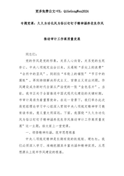 【七哥公文】2025年:专题党课:久久为功化风为俗以钉钉子精神涵养优良作风推动审计工作高质量发展+更多免费公文+VX:QiGeGongWen2024+更多免费公文+VX:QiGeGongWen2024