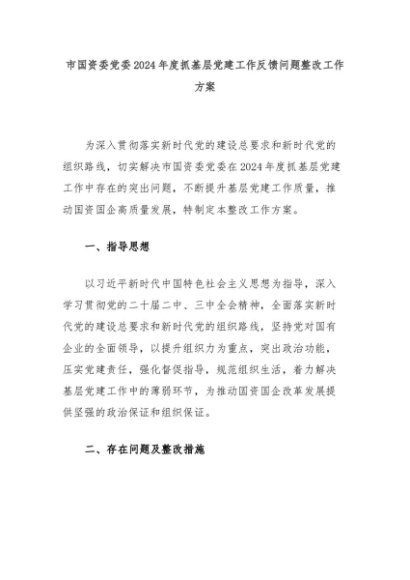 【七哥公文】2025年:市国资委党委2024年度抓基层党建工作反馈问题整改工作方案+更多免费公文+VX:QiGeGongWen2024