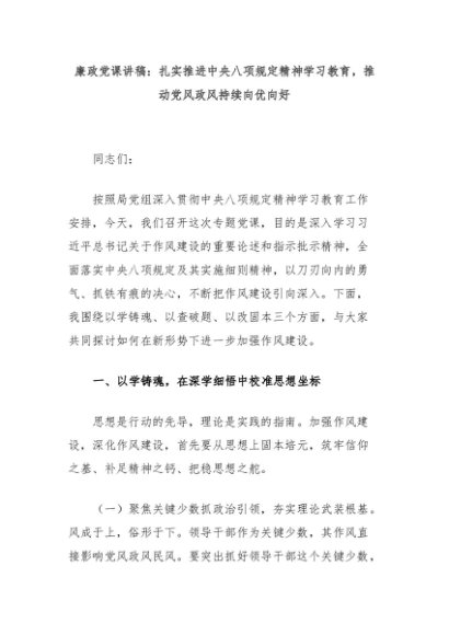 【七哥公文】2025年:廉政党课讲稿:扎实推进中央八项规定精神学习教育,推动党风政风持续向优向好+更多免费公文+VX:QiGeGongWen2024