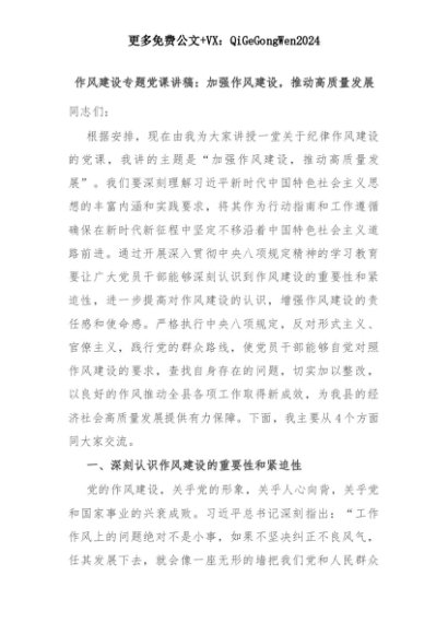 【七哥公文】2025年:作风建设专题党课讲稿:加强作风建设,推动高质量发展+更多免费公文+VX:QiGeGongWen2024+更多免费公文+VX:QiGeGongWen2024