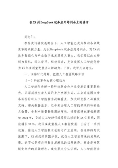 【七哥公文】2025年:在XX州DeepSeek政务应用培训会上的讲话+更多免费公文+VX:QiGeGongWen2024