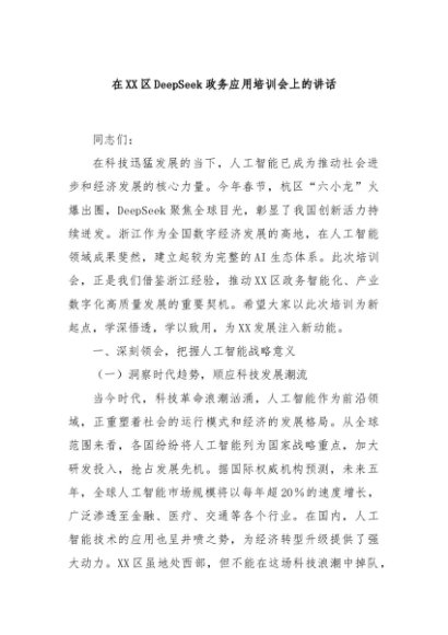 / 【七哥公文】2025年:在XX区DeepSeek政务应用培训会上的讲话+更多免费公文+VX:QiGeGongWen2024