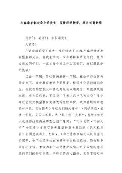 【七哥公文】2025年:在春季表彰大会上的发言:深耕科学教育,共启创意新程+更多免费公文+VX:QiGeGongWen2024