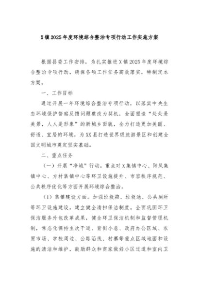 / 【七哥公文】2025年:X镇2025年度环境综合整治专项行动工作实施方案+更多免费公文+VX:QiGeGongWen2024