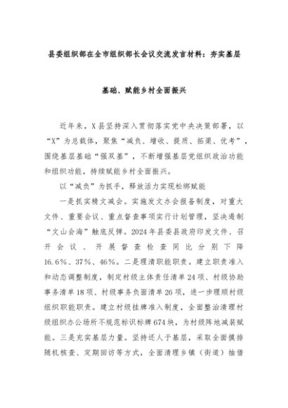 【七哥公文】2025年:县委组织部在全市组织部长会议交流发言材料:夯实基层基础、赋能乡村全面振兴+更多免费公文+VX:QiGeGongWen2024
