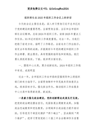 【七哥公文】2025年:组织部长在2025年组织工作会议上的讲话+更多免费公文+VX:QiGeGongWen2024+更多免费公文+VX:QiGeGongWen2024