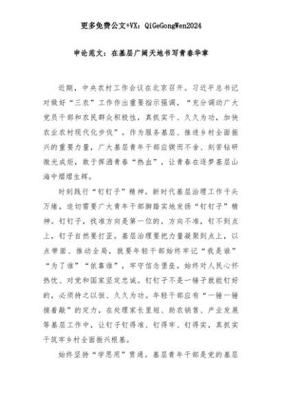 【七哥公文】2025年:申论范文:在基层广阔天地书写青春华章+更多免费公文+VX:QiGeGongWen2024+更多免费公文+VX:QiGeGongWen2024