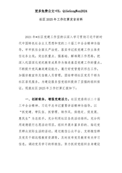 【七哥公文】2025年:社区2025年工作打算发言材料+更多免费公文+VX:QiGeGongWen2024+更多免费公文+VX:QiGeGongWen2024