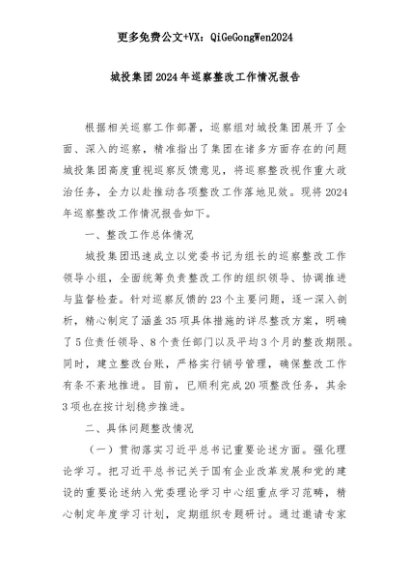 【七哥公文】2025年:城投集团2024年巡察整改工作情况报告+更多免费公文+VX:QiGeGongWen2024+更多免费公文+VX:QiGeGongWen2024