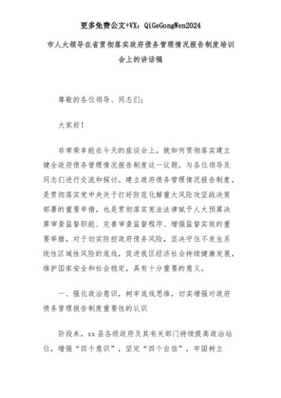 【七哥公文】2025年:市人大领导在省贯彻落实政府债务管理情况报告制度培训会上的讲话稿+更多免费公文+VX:QiGeGongWen2024+更多免费公文+VX:QiGeGongWen2024