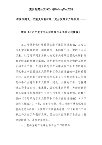 【七哥公文】2025年:在强国建设、民族复兴新征程上充分发挥主力军作用 ——学习《习近平关于工人阶级和工会工作论述摘编》+更多免费公文+VX:QiGeGongWen2024+更多免费公文+VX:QiGeGongWen2024