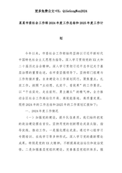 【七哥公文】2025年:某某市委社会工作部2024年度工作总结和2025年度工作计划+更多免费公文+VX:QiGeGongWen2024+更多免费公文+VX:QiGeGongWen2024