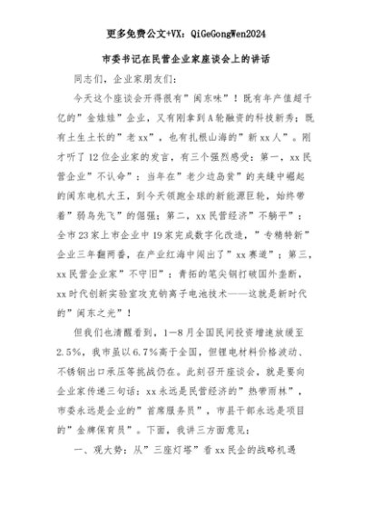【七哥公文】2025年:市委书记在民营企业家座谈会上的讲话+更多免费公文+VX:QiGeGongWen2024+更多免费公文+VX:QiGeGongWen2024