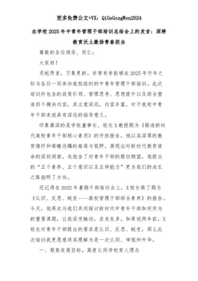 【七哥公文】2025年:在学校2025年中青年管理干部培训总结会上的发言:深耕教育沃土激扬青春担当+更多免费公文+VX:QiGeGongWen2024+更多免费公文+VX:QiGeGongWen2024