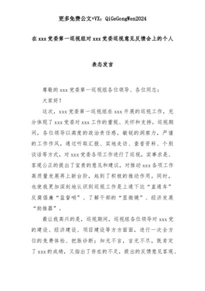 【七哥公文】2025年:在xxx党委第一巡视组对xxx党委巡视意见反馈会上的个人表态发言+更多免费公文+VX:QiGeGongWen2024+更多免费公文+VX:QiGeGongWen2024