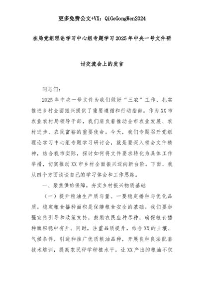【七哥公文】2025年:在局党组理论学习中心组专题学习2025年中央一号文件研讨交流会上的发言+更多免费公文+VX:QiGeGongWen2024+更多免费公文+VX:QiGeGongWen2024