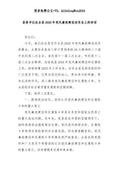 【七哥公文】2025年:县委书记在全县2025年党风廉政建设动员会上的讲话+更多免费公文+VX:QiGeGongWen2024+更多免费公文+VX:QiGeGongWen2024