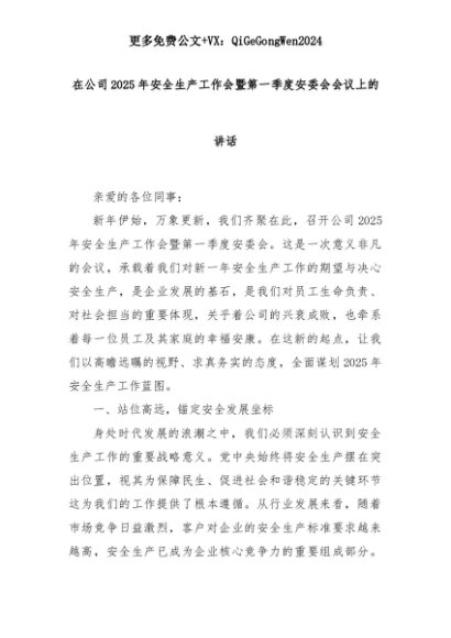 【七哥公文】2025年:在公司2025年安全生产工作会暨第一季度安委会会议上的讲话+更多免费公文+VX:QiGeGongWen2024+更多免费公文+VX:QiGeGongWen2024