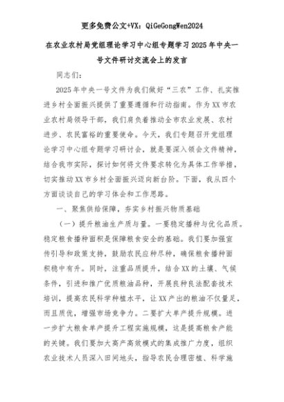 【七哥公文】2025年:在农业农村局党组理论学习中心组专题学习2025年中央一号文件研讨交流会上的发言+更多免费公文+VX:QiGeGongWen2024+更多免费公文+VX:QiGeGongWen2024