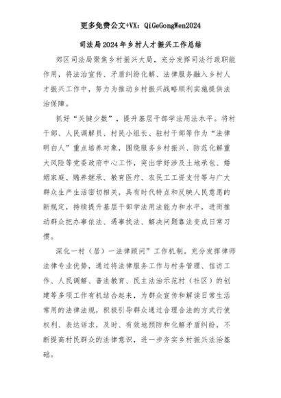 【七哥公文】2025年:司法局2024年乡村人才振兴工作总结+更多免费公文+VX:QiGeGongWen2024+更多免费公文+VX:QiGeGongWen2024