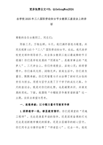 【七哥公文】2025年:在学校2025年三八国际劳动妇女节女教职工座谈会上的讲话+更多免费公文+VX:QiGeGongWen2024+更多免费公文+VX:QiGeGongWen2024