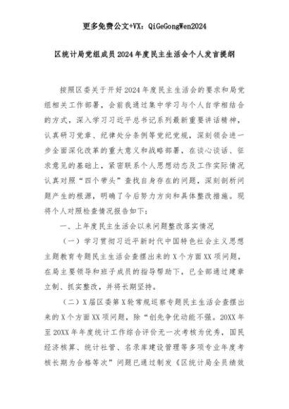 【七哥公文】2025年:区统计局党组成员2024年度民主生活会个人发言提纲+更多免费公文+VX:QiGeGongWen2024+更多免费公文+VX:QiGeGongWen2024