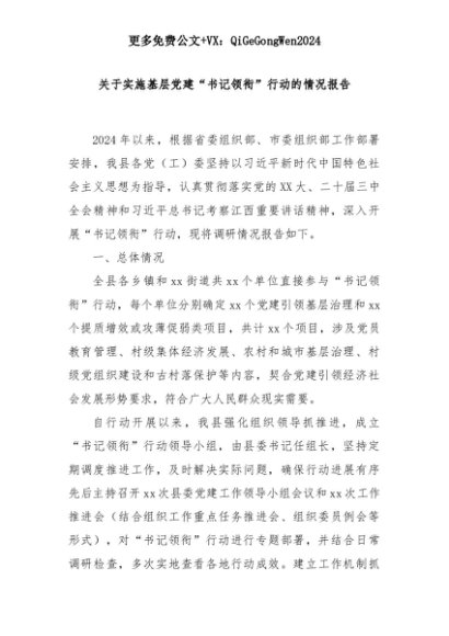 【七哥公文】2025年:关于实施基层党建“书记领衔”行动的情况报告+更多免费公文+VX:QiGeGongWen2024+更多免费公文+VX:QiGeGongWen2024